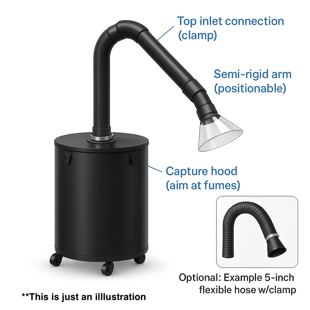 Aim the semi-rigid capture arm directly at the source to prevent smoke and VOCs from spreading. Mounts on the top inlet of the Airpura 900‑series in minutes and stays where you set it. You can also use your own arm or a 5-inch flexible hose with a band clamp; the arm is optional, not required. Remove any hose/arm before opening the top for service.