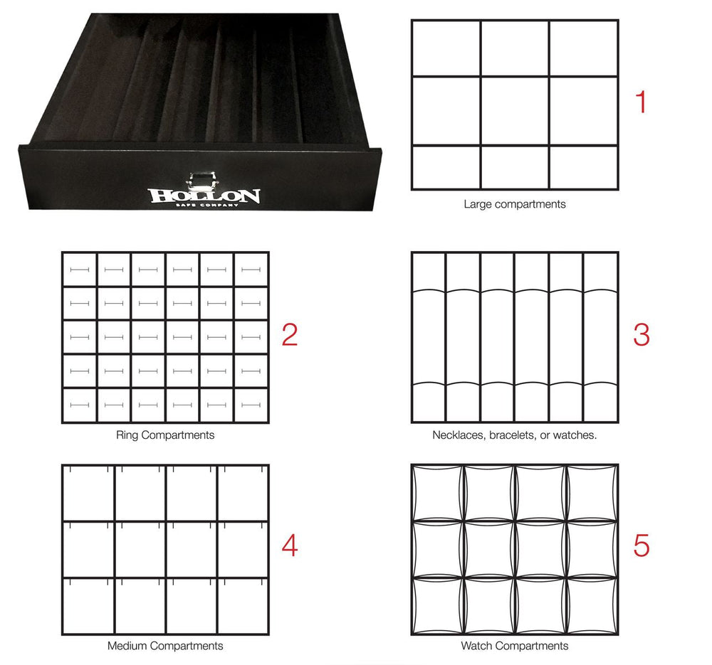 The Hollon line of Jewelry Safes offers you protection for your most precious items. These safes are made to comfortably fit in closets, dressing rooms, and offices. The jewelry drawers are high gloss black and lined with black velvet. Each drawer is designed to fit your collection of rings, watches, bracelets, necklaces, earrings, and more.