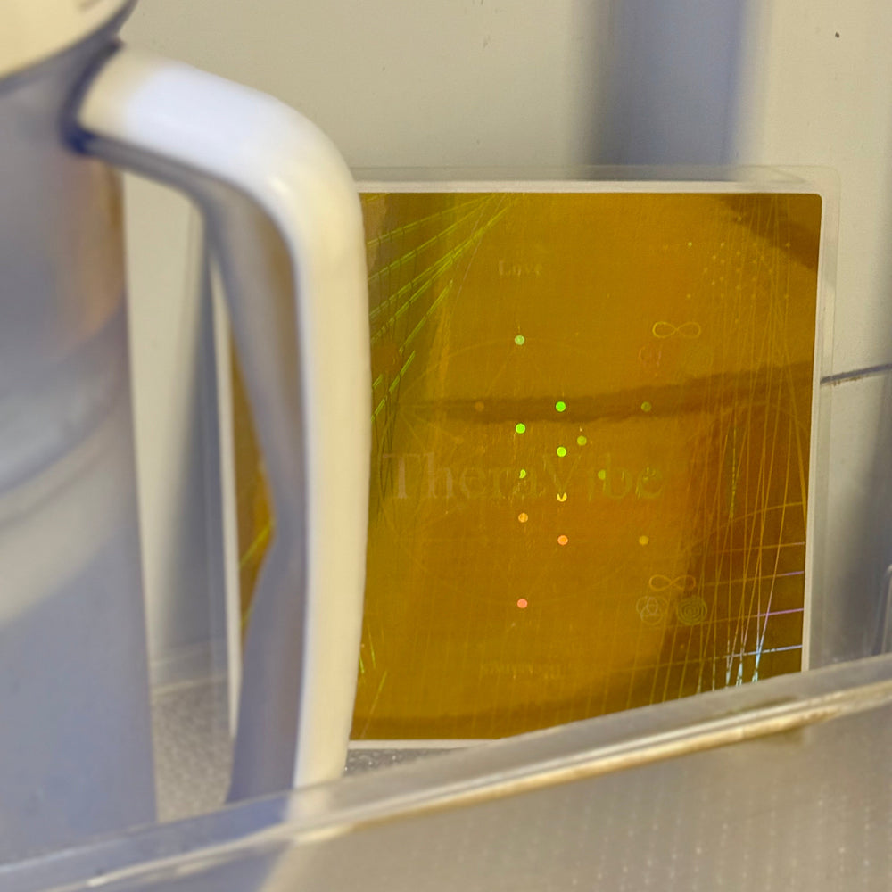 This high-vibrational 6x6 multilayer laminated hologram features infused 18k gold, sacred geometry, and intentional affirmations—designed to naturally extend the shelf life of all food and drinks by weeks, while also restructuring water in your food source.