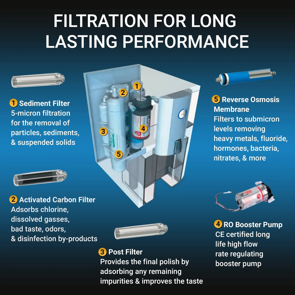 Uses only 24W of power, less than a light bulb, and has a 50% (1:1) recovery rate – the best among reverse osmosis filters.