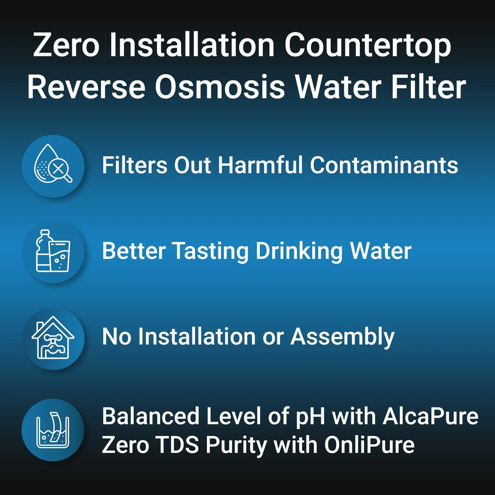 AlcaPure Edition Filtered Water has a small amount of Calcium and Magnesium Minerals returned back to purified water to give you a taste comparable to your favorite bottled water: Alkaline 7-8pH, with beneficial minerals added. -OR- OnliPure Edition Filtered Water brings the TDS reading to zero. Zero TDS or Total Dissolved Solids is perfect for people who want Absolute Purity.